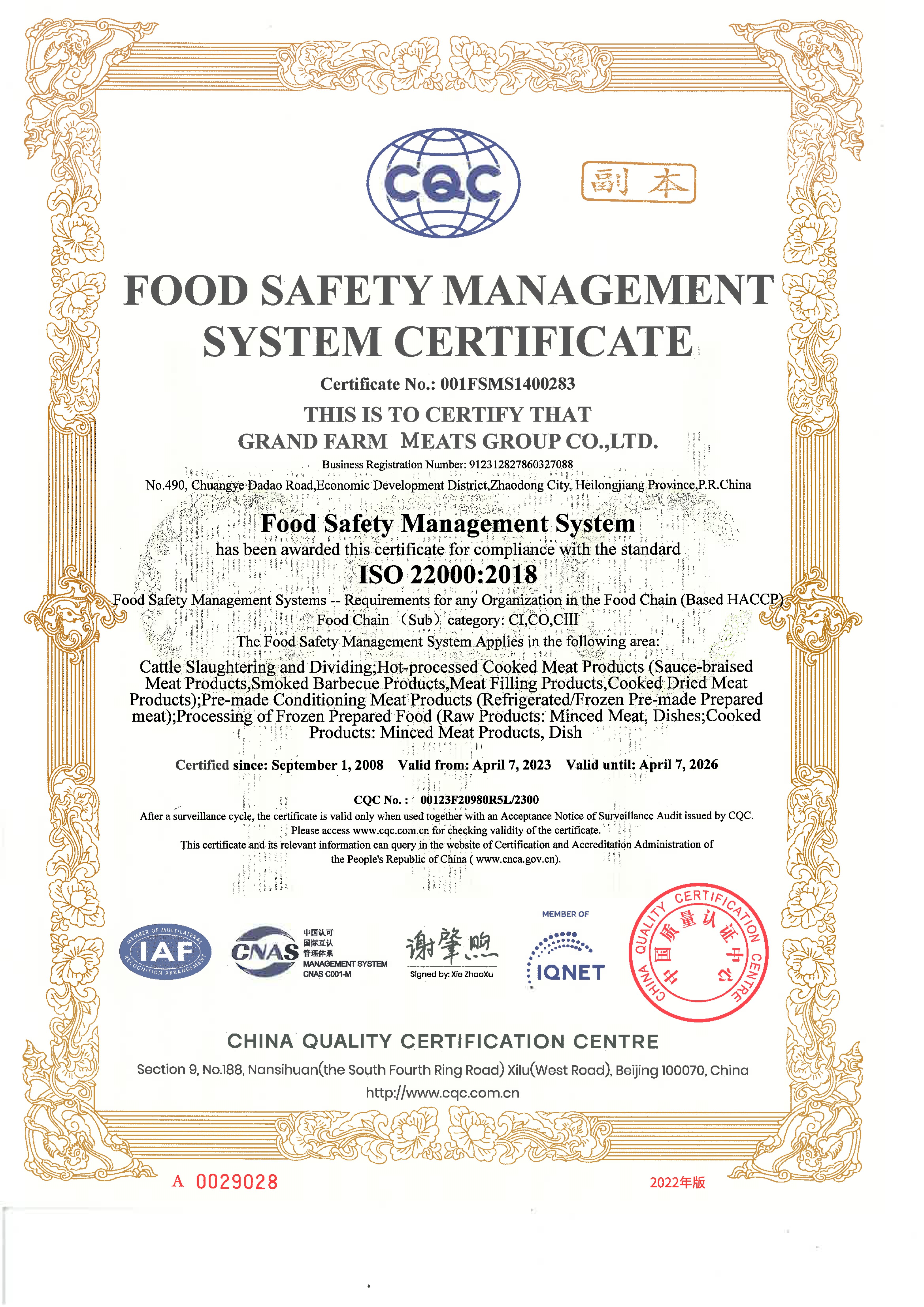 食品安全管理體系認(rèn)證證書(ISO22000)中文