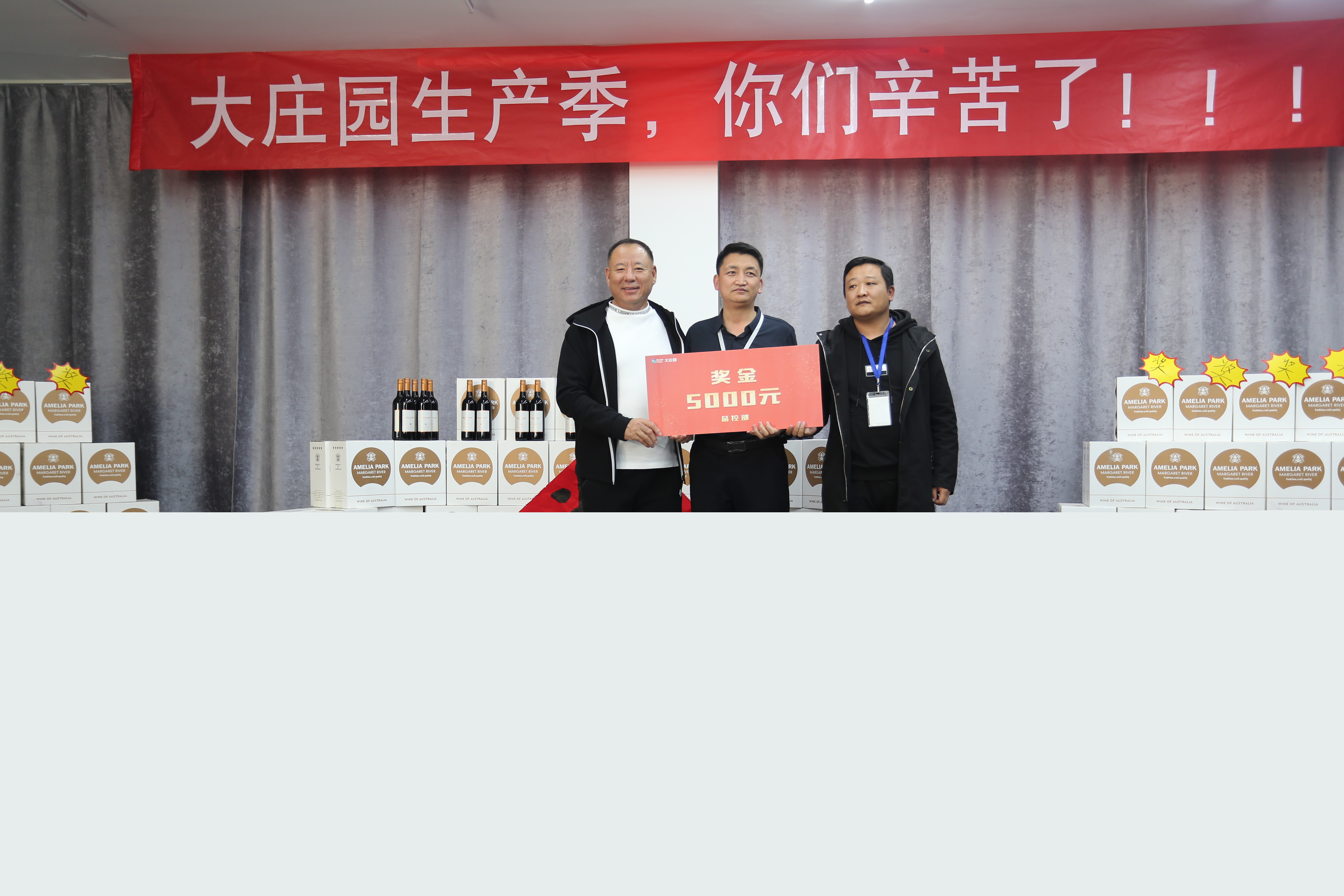 在全場如雷的掌聲中,大莊園集團(tuán)董事長陳希濱先生向連續(xù)十五天達(dá)成7000+的“主力軍”:生產(chǎn)部、采購部、品控部和設(shè)備部頒發(fā)了總額為10萬元的獎(jiǎng)金,向全體節(jié)日期間堅(jiān)持奮戰(zhàn)在工作崗位的員工頒發(fā)了“專項(xiàng)獎(jiǎng)勵(lì)”——每人兩瓶價(jià)值不菲的澳洲紅酒。
