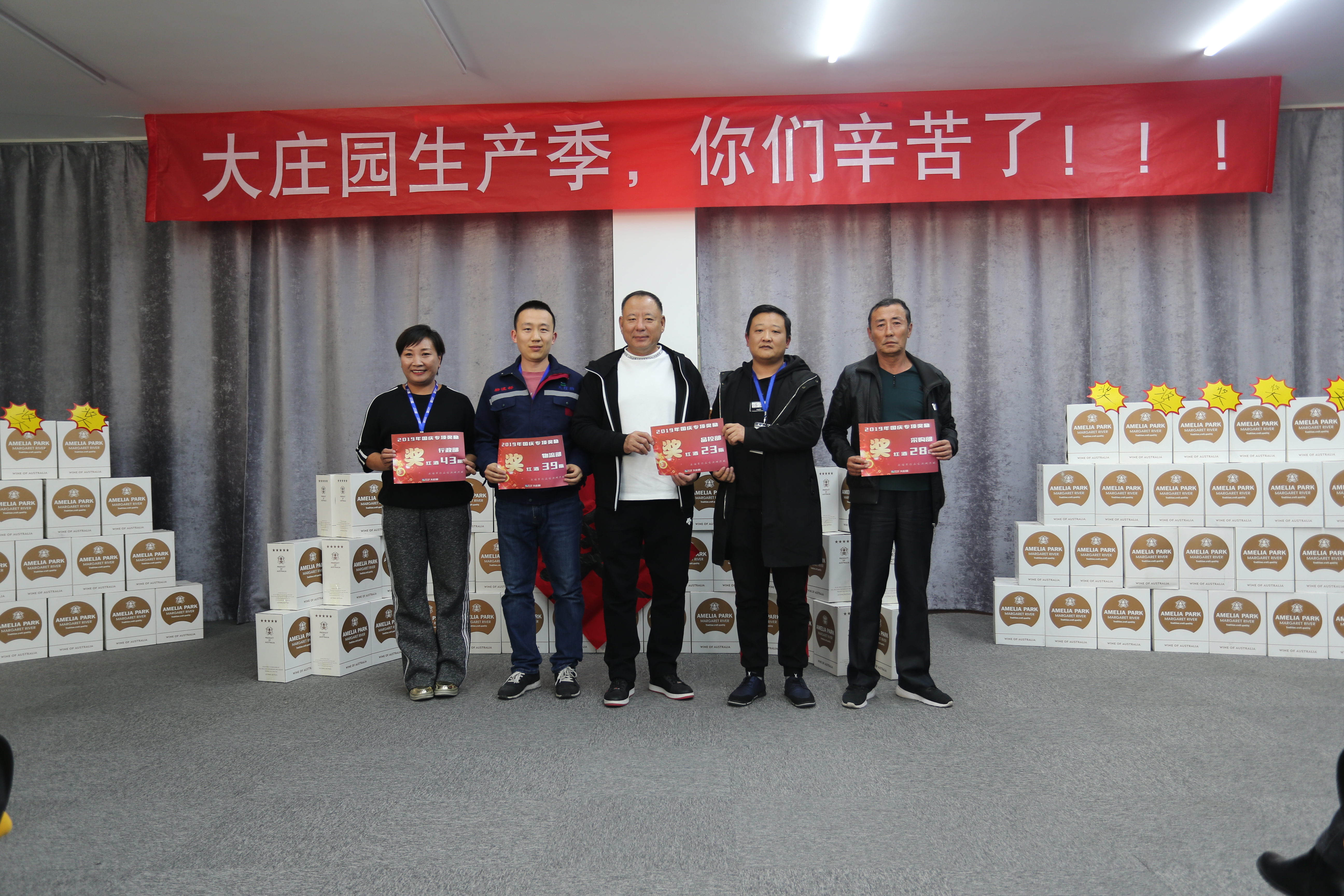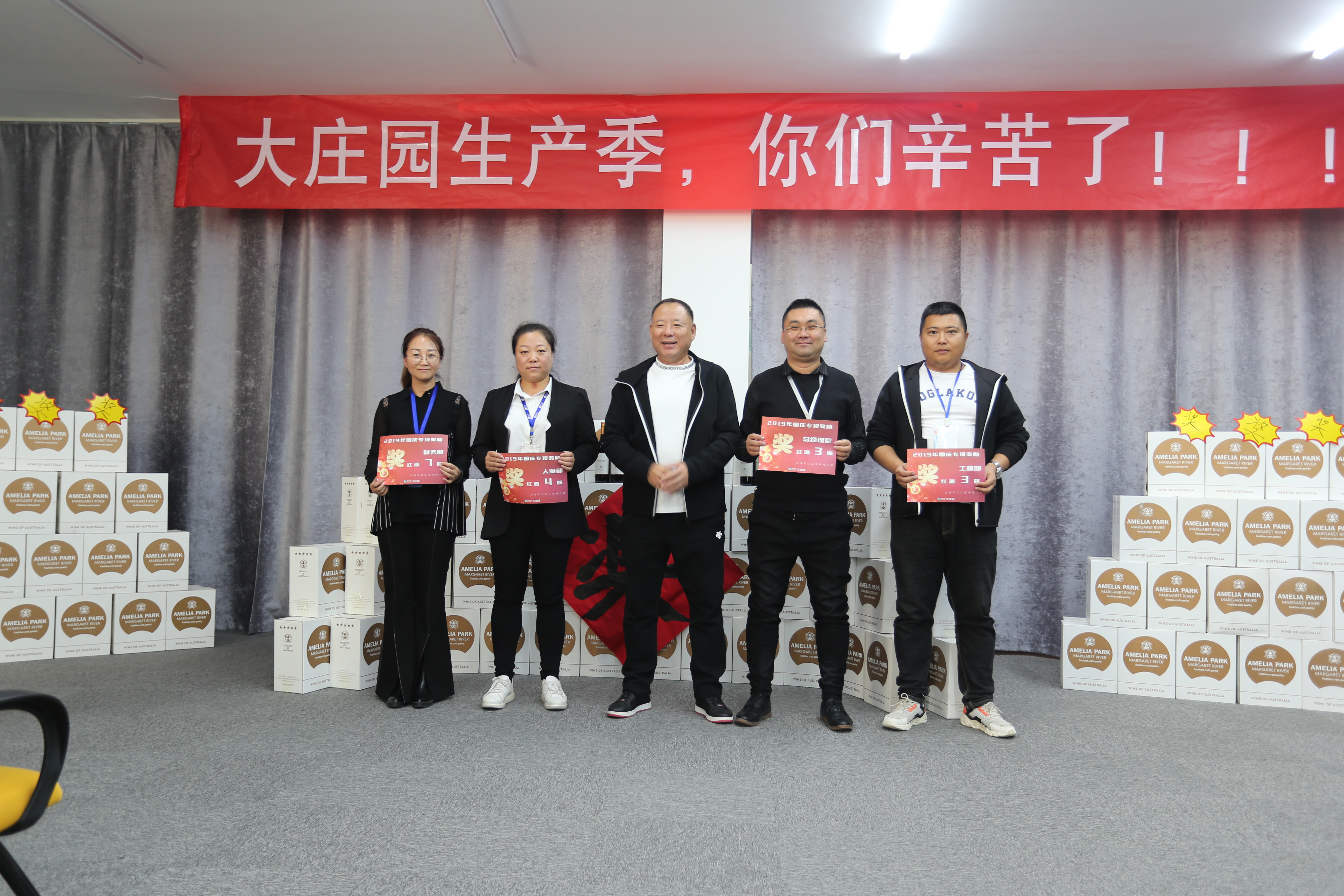 會(huì)場正中,高掛著“大莊園生產(chǎn)季,你們辛苦了?。?!”的條幅,而紅酒墻上那個(gè)斗大的“獎(jiǎng)”字更是直接點(diǎn)出了這次大會(huì)的主題。