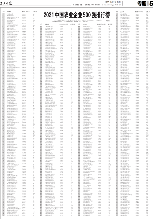 《農(nóng)民日?qǐng)?bào)》是我國(guó)歷史上第一張面向全國(guó)農(nóng)村發(fā)行的報(bào)紙,是一份中央級(jí)、綜合性大報(bào)。2018年以來(lái),農(nóng)民日?qǐng)?bào)社連續(xù)推出四屆中國(guó)農(nóng)業(yè)企業(yè)500強(qiáng)榜單。2021年榜單參照國(guó)際通行評(píng)價(jià)辦法,由企業(yè)按照要求進(jìn)行申報(bào)或采用公開(kāi)數(shù)據(jù),依據(jù)2020年農(nóng)業(yè)企業(yè)營(yíng)業(yè)收入排序產(chǎn)生,500強(qiáng)企業(yè)2020年?duì)I收范圍在12.47億元~5303.05億元之間。